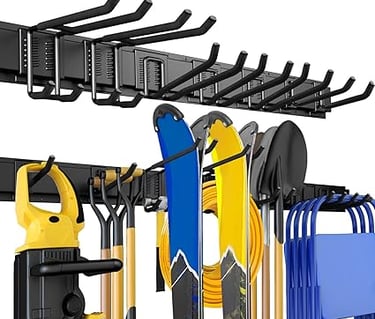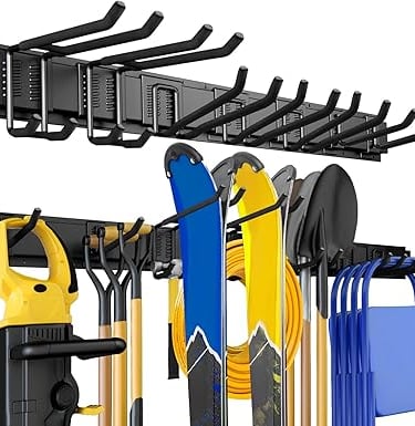 A wall-mounted storage rack designed for garages with limited floor space, perfect for neatly hanging tools, gear, and supplies. Reviewers rave about its exceptional sturdiness, making it an ideal choice for safely storing even your heaviest items.