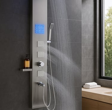 Transform your bathroom into a modern spa retreat with the 6-Mode LED Shower Panel. Designed with style, comfort, and innovation in mind, this shower system combines adjustable 12-inch jets, rainfall, mist spray, and LED lighting to create a soothing and personalized showering experience.