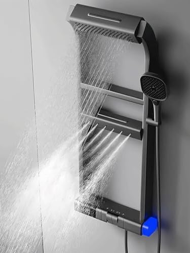 Upgrade your bathroom with a 6-Mode LED Shower Panel featuring 12" adjustable jets, rain & mist functions, built-in mixer, and storage shelf.