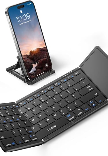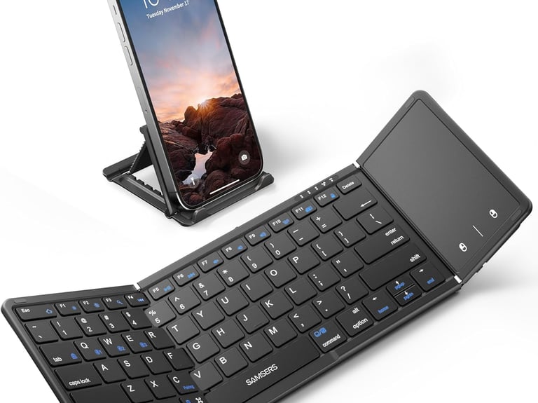 These keyboards connect wirelessly to smartphones, tablets, laptops, and even smart TVs using Bluetooth technology. When unfolded, they provide a full QWERTY layout with comfortable spacing. The built-in touchpad replaces the need for a separate mouse, allowing easy navigation and multitasking.