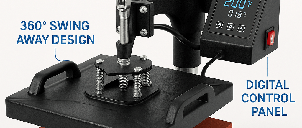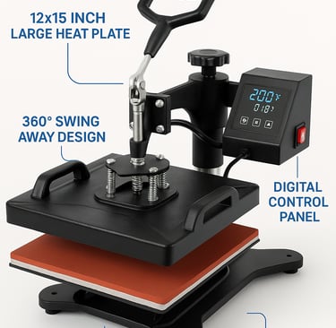 Discover the 12x15 Inch Heat Press Machine with 360° Swing Away design.