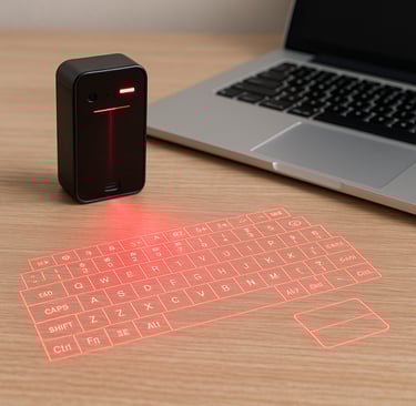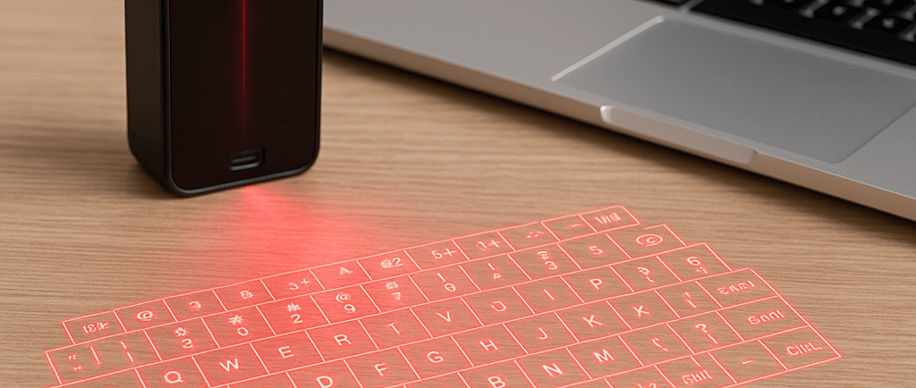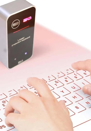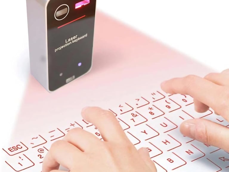 A projection keyboard emits a virtual layout of keys onto a desk or table using a laser projector. A built-in sensor detects finger movements and translates them into keystrokes. Similarly, the projection mouse uses touch and gesture recognition to replicate the functions of a traditional mouse.