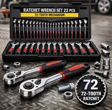 22-piece ratchet wrench set with 72-tooth precision and anti-slip grip. Durable steel design for automotive, industrial, and DIY work.
